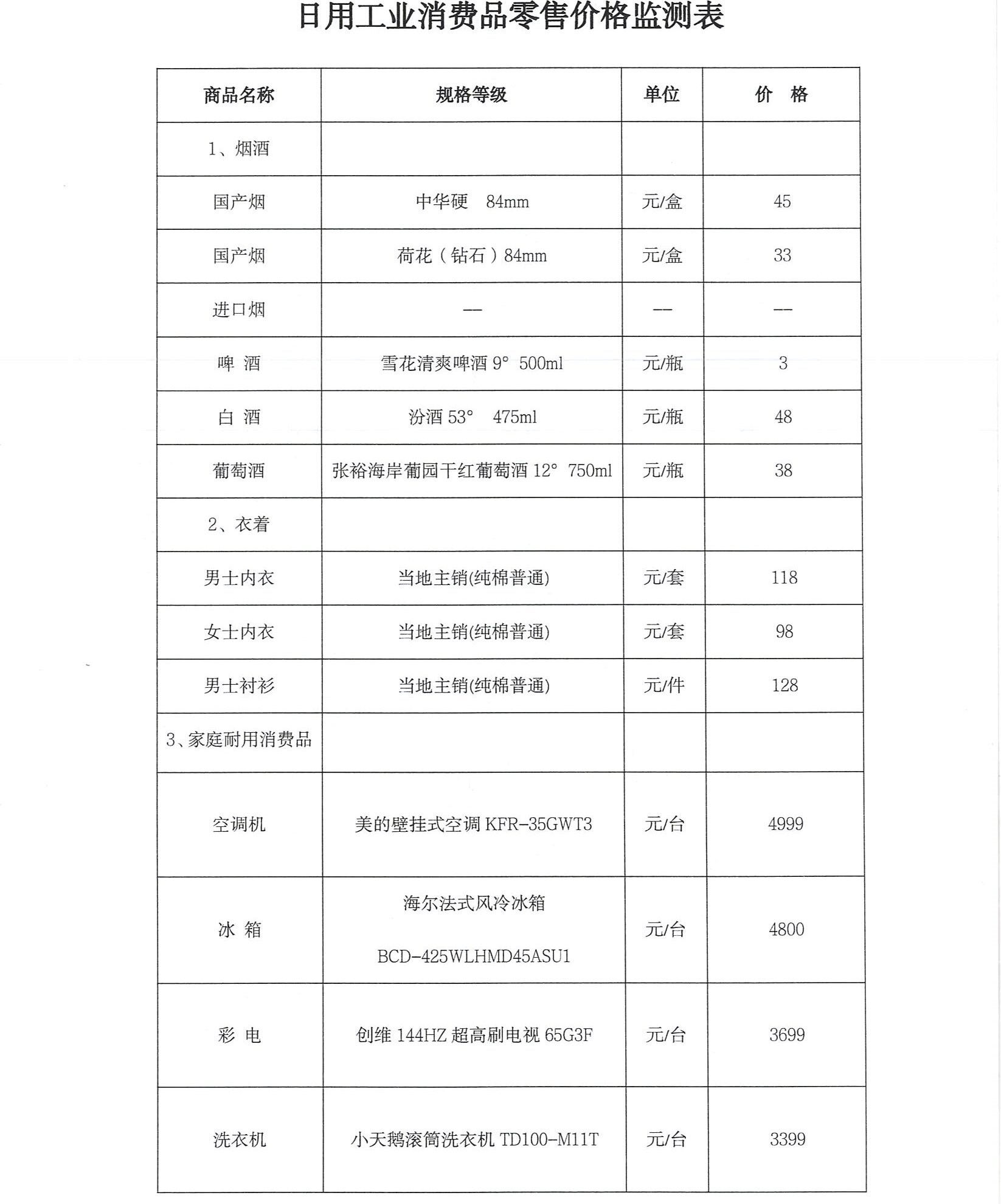 日用工业消费品零售价格监测表.doc