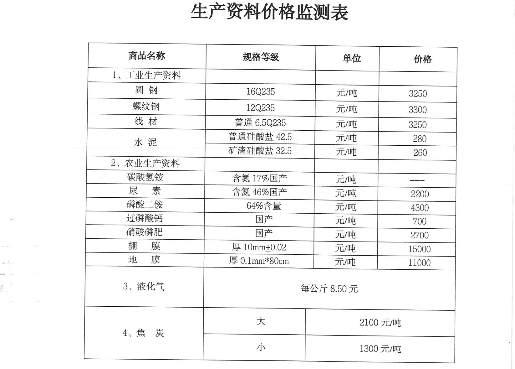 生产资料价格监测表.doc