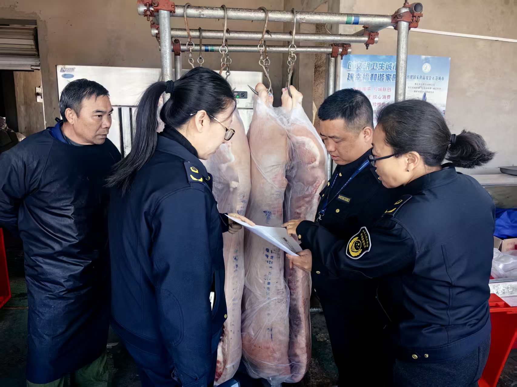 此次检查重点以农贸市场鲜肉批发经营户为重点,严格查验肉制品“两证两章”(动物检疫合格证明、肉品品质检验合格证明、检疫验讫印章、肉品品质检验验讫印章),仔细核对进货台账及索证索票情况,确保每一批次肉制品来源可溯、资质合规;严禁销售“三无”、过期、腐败变质肉制品。这次检查,共排查鲜肉经营户7家,并对其中3家不符合环境卫生的经营户下达了当场处罚决定书。