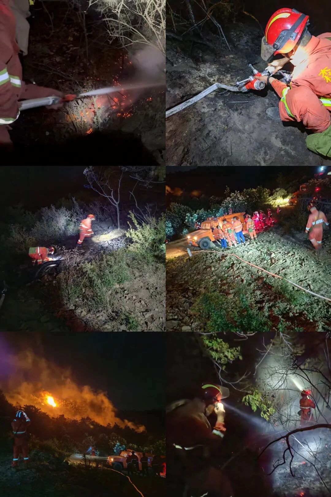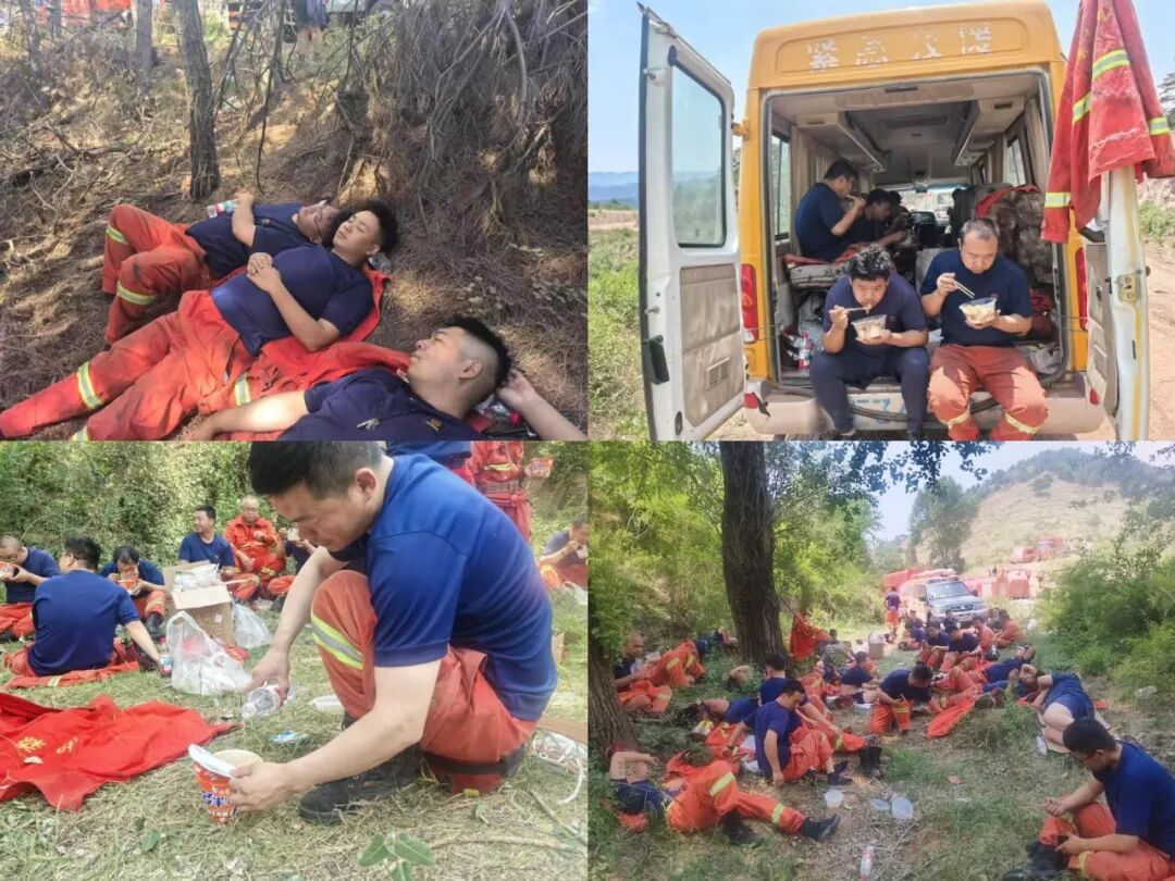 短暂休整后,6月10日凌晨再次出发进入新的起火点进行灭火救援。现场火势较大、风向多变、火情复杂,队员顶风进入火场灭火,浓烟熏烤双眼,汗水浸湿衣服,面对熊熊烈火,无一人退缩,不少队员的脸被划伤,大家全然不顾,奋力扑救,充分发扬了应急铁军不畏困难、敢打敢拼的优良作风,饿了就啃一口干粮,渴了就喝一口水,累了困了几个人抱团在树下打个盹,休整后继续投入战斗。截至目前山火仍在持续扑救中。