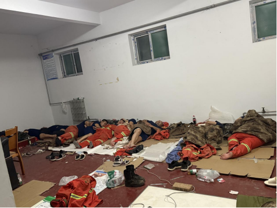连续奋战一夜后火情得到有效控制,救护队队员们和衣而卧、席地而睡,随时准备处置突发特情。