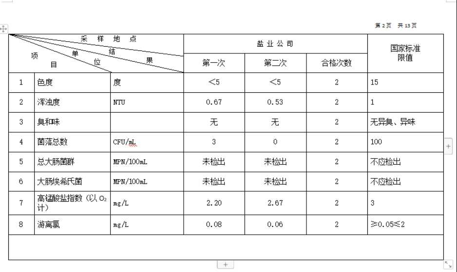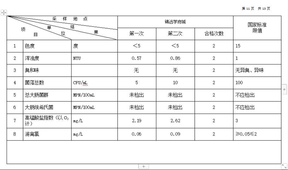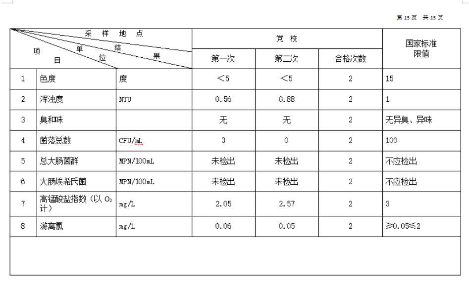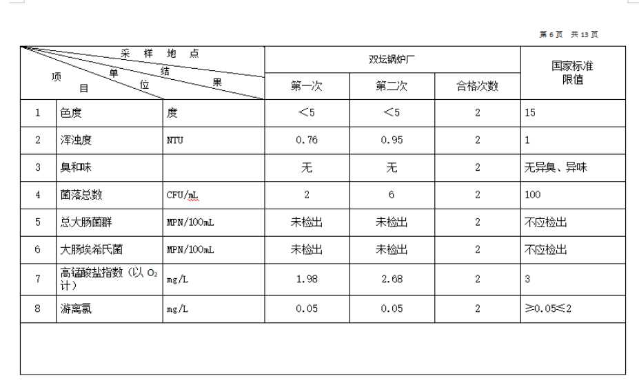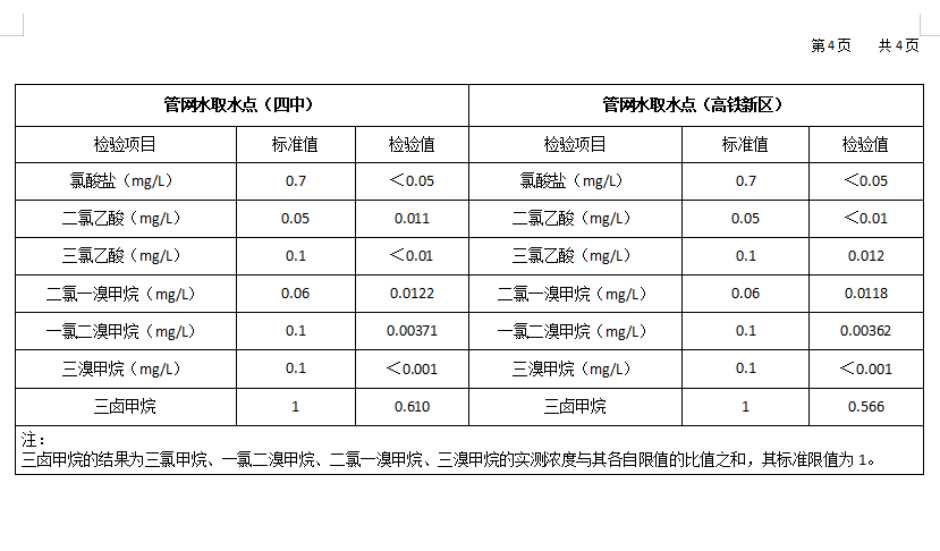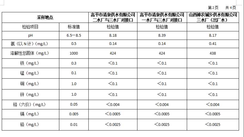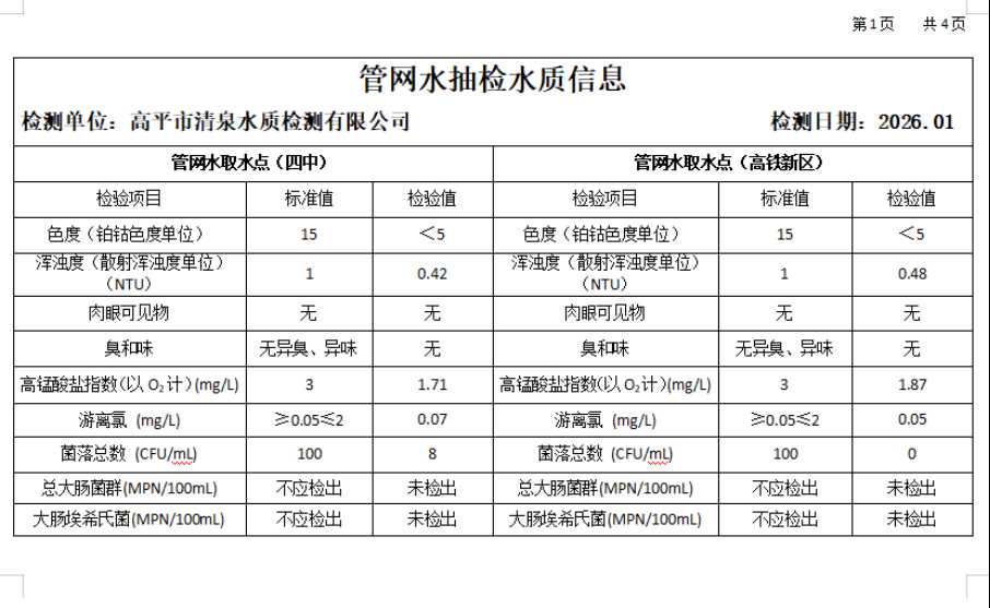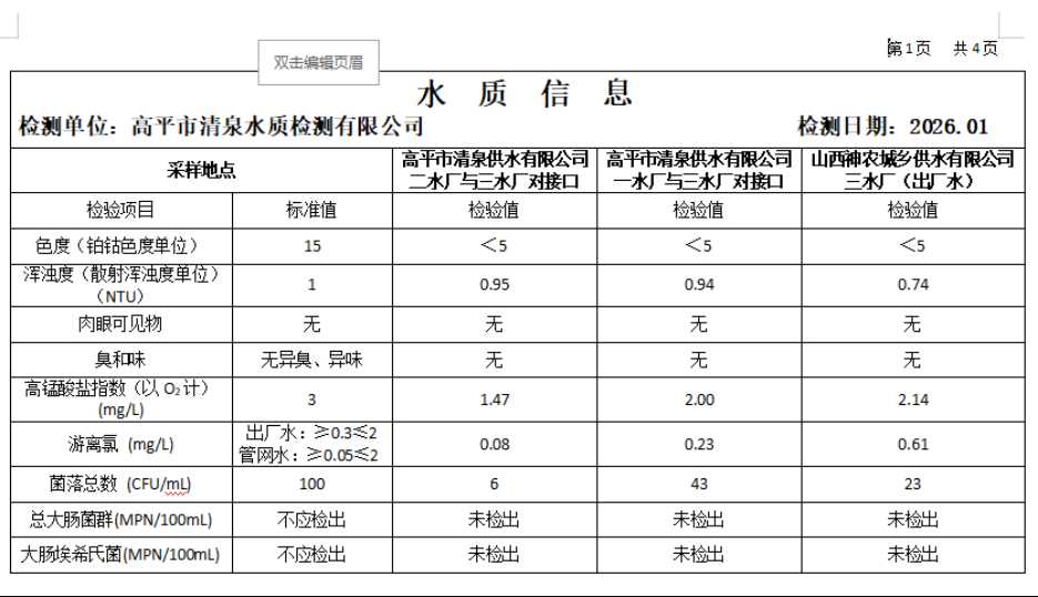 高平市清泉供水有限公司2026年1月份城市集中供水水质信息