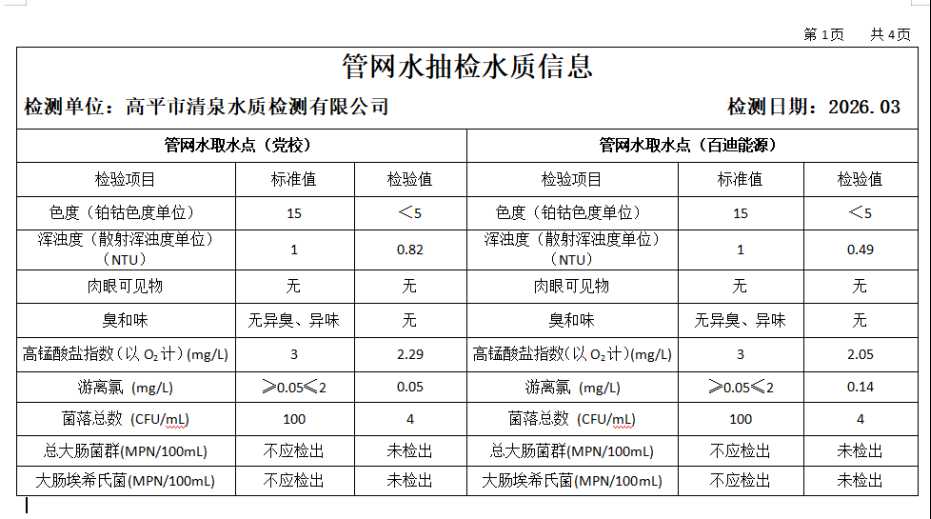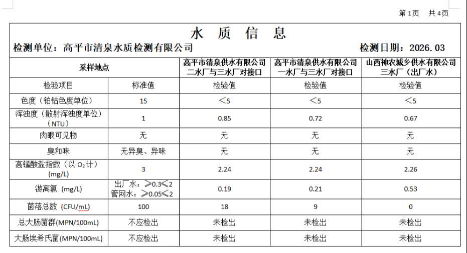 高平市清泉供水有限公司2026年3月份城市集中供水水质信息