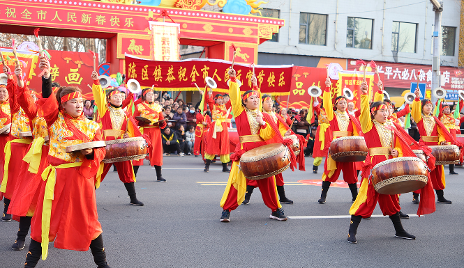 王村村,威风锣鼓震天地。鼓声雷动,气势如虹。王村村威风锣鼓队一亮相,便以排山倒海之势点燃全场。鼓手们挥槌如雨,锣钹齐鸣,节奏时如万马奔腾,时如春雷滚地。这支由村民组成的队伍,将北方汉子的豪迈与新时代农民的精气神展现得淋漓尽致,鼓点中敲出的是丰收的喜悦,更是乡村振兴的铿锵足音。