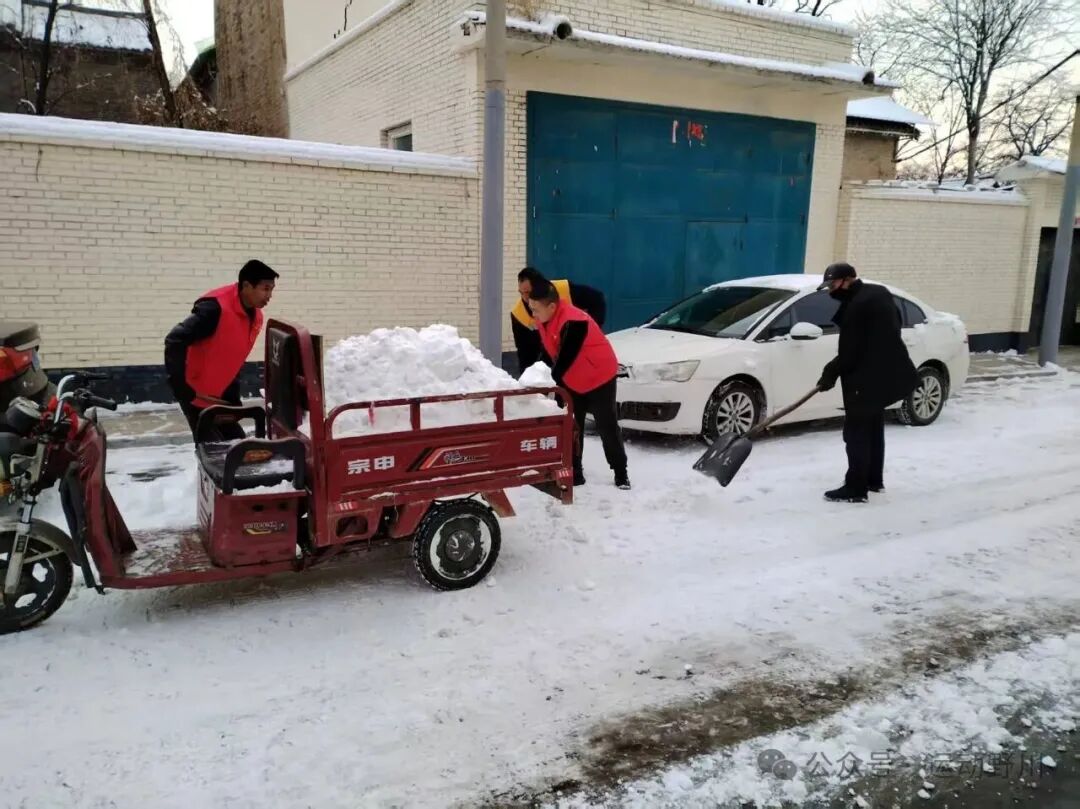 镇村两级同频共振,凝聚“一股劲”合力。各村迅速响应,第一时间组织党员志愿者、村民代表、环卫工人组建清雪队伍,同步发动村内沿街商铺落实“门前三包”责任,参与除雪除险工作中。大家分工协作、默契配合,挥锹铲冰、扫雪成堆,针对乡村小道、巷道拐角等机械难以覆盖的区域,采取人工扫雪作业模式。经过一番连续奋战,全镇主次干道、乡村要道、重点区域的积雪积冰已基本清除,为群众开辟出一条条安全畅通的“暖心通道”。